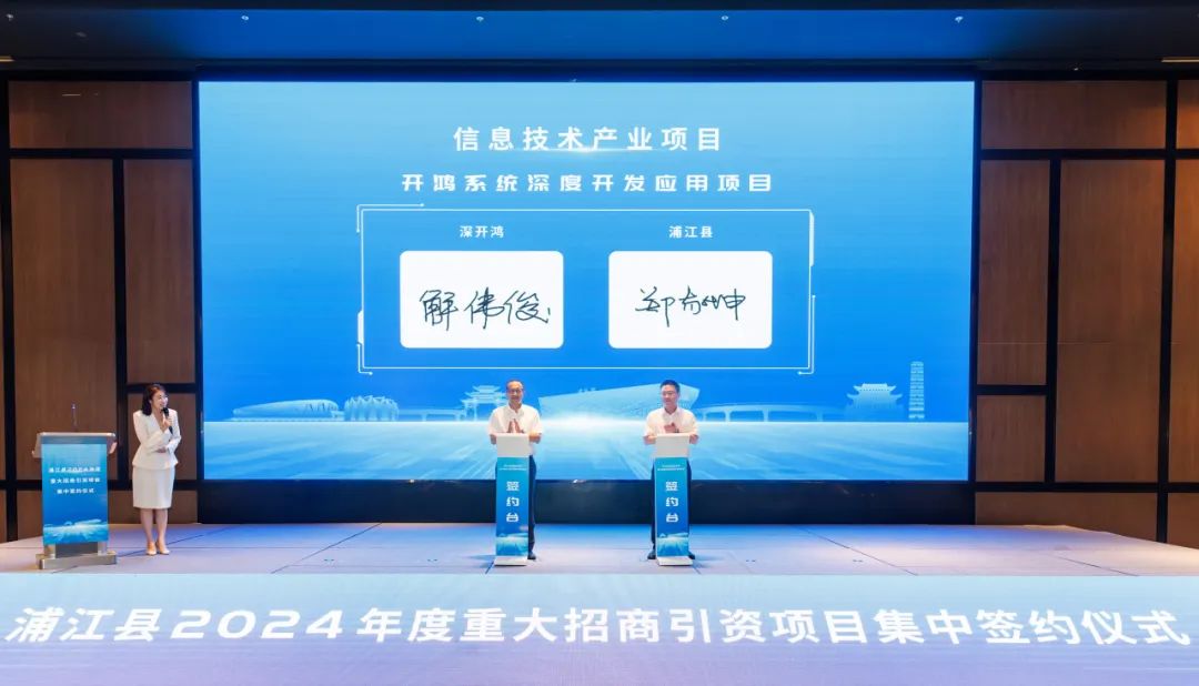 近日,浙江金华浦江县举行2024年度重大招商引资项目集中签约仪式,会上,深开鸿与浦江县达成战略合作,双方将基于开鸿安全数字底座,携手赋能浦江县当地600多家企业数字化转型。